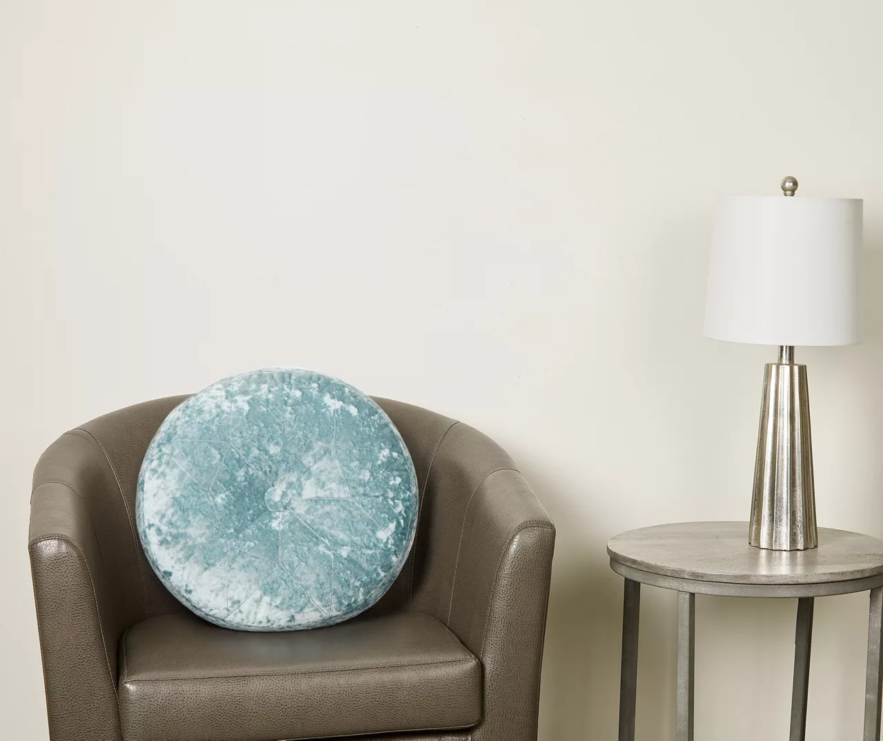 Adding a pop of color and comfort to your space has never been so easy. The Jolie round velvet toss pillow from Broyhill is a perfect addition to any sofa, accent chair or bed. A deep aqua color, luxurious crushed velvet finish and plush comfort make this a can’t miss! Tufting at the center and a geometric paneled design complete the look for statement-making style.